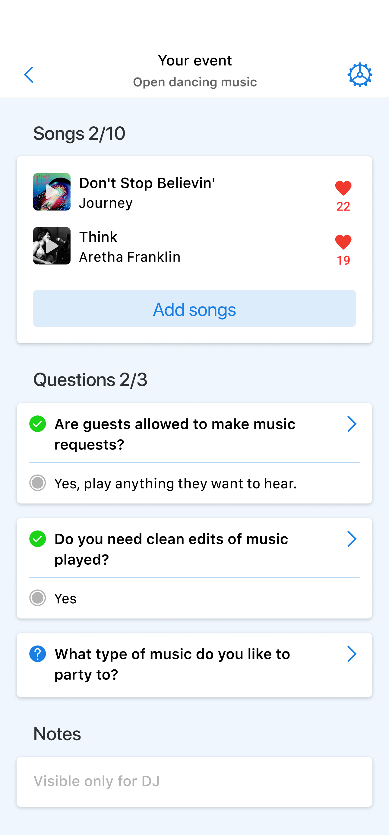 Experience seamless music planning with our mobile app! Add your favorite songs, organize your wedding day schedule, share details with guests and loved ones, and manage all production aspects right from the app. Heard a great song on Spotify? Add it to your playlist instantly!